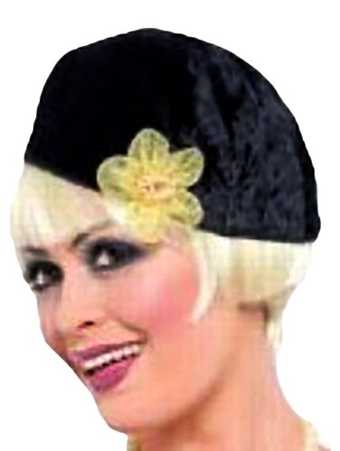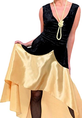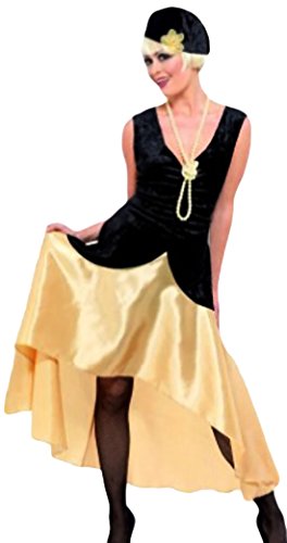 So kommen die glamourösen 20er Jahre glänzend zum Vorschein. Das Kleid hat ein schwarzes Samt-Mieder mit Low-Cut-Ausschnitt. Der Hingucker ist der asymmetrisch geschnittene Satin-Rock, der Ihre Beine kleidsam zur Geltung bringt. Der passende Hut und die Kette gehören zum Lieferumfang.